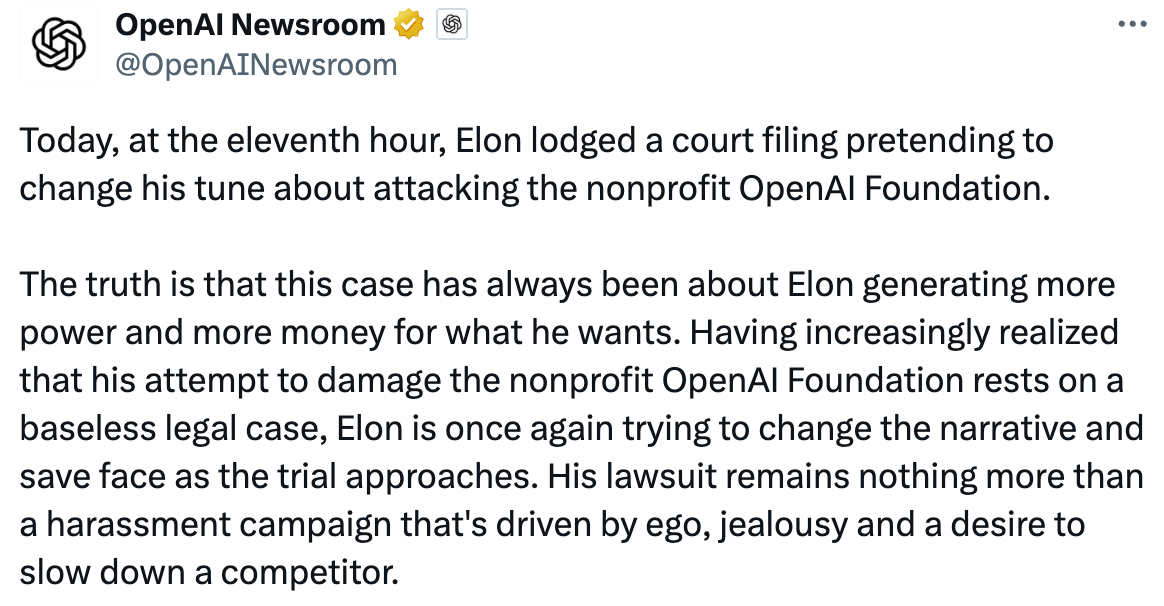 OpenAI called the move “nothing more than a harassment campaign” in a post on X: