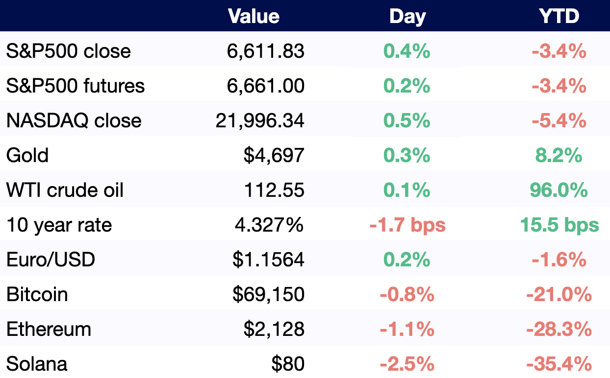 All values as of 6 AM ET / 3 AM PT, other than S&P500 and NASDAQ close (4 PM ET / 1 PM PT).