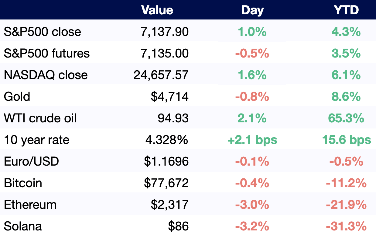 All values as of 6 AM ET / 3 AM PT, other than S&P500 and NASDAQ close (4 PM ET / 1 PM PT).