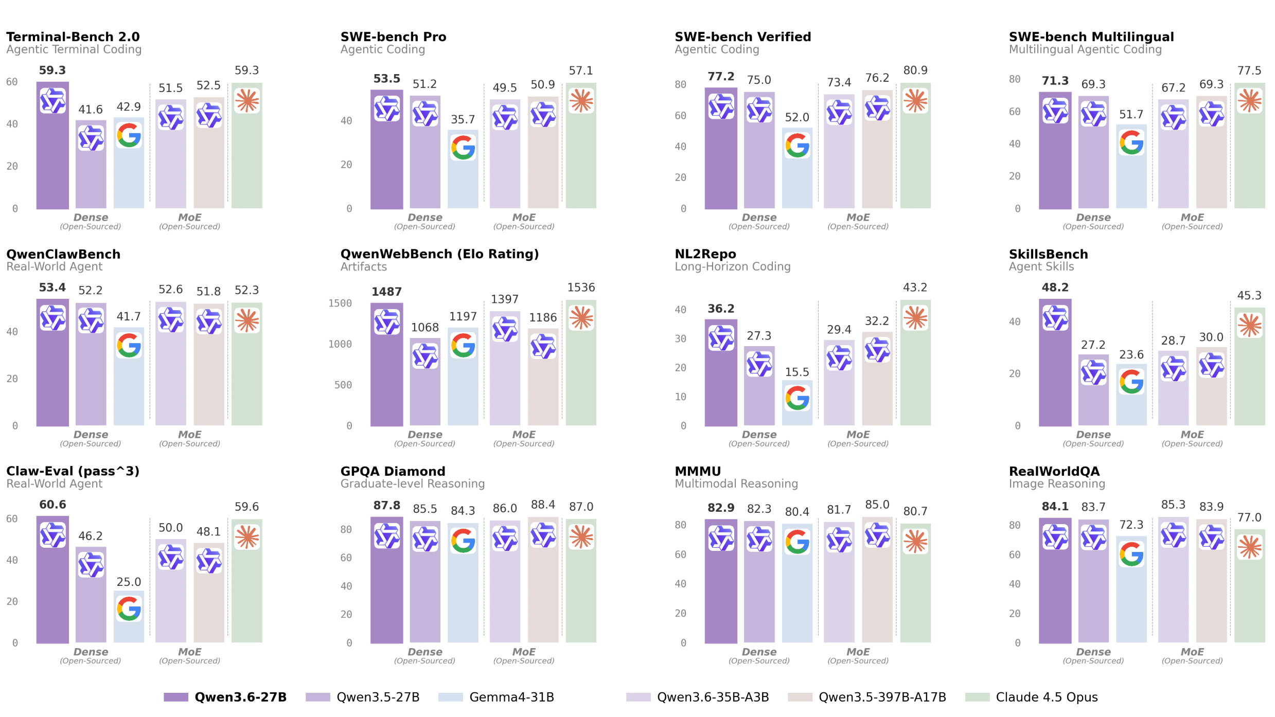 Qwen3.6-27B delivered competitive results vs. Gemma4-31B and Claude Opus 4.5 on early benchmarks: