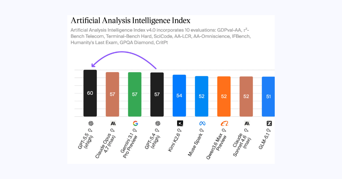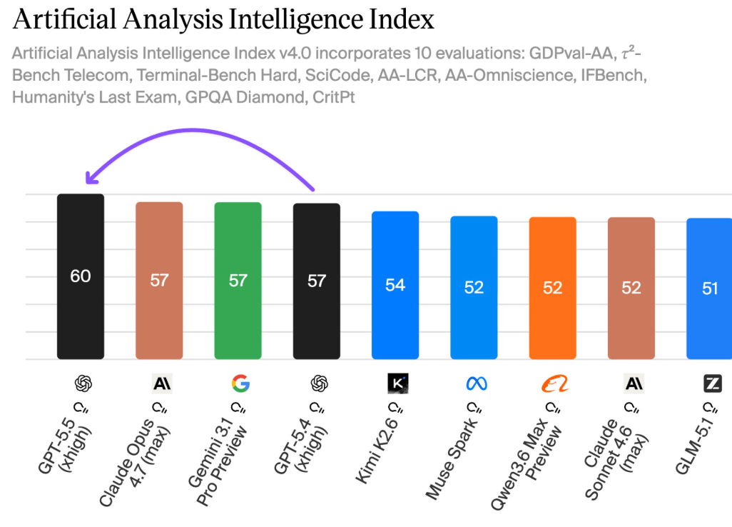 GPT-5.5 topped the Artificial Analysis Intelligence Index (of public models), overtaking Claude Opus 4.7 and Gemini 3.1 Pro: