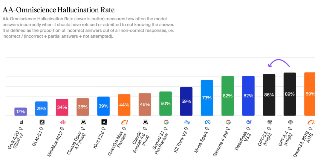 Similarly to GPT-5.4, GPT-5.5 (xhigh) has an 86% hallucination rate vs. Opus 4.7 (36%) and Gemini 3.1 Pro (50%)