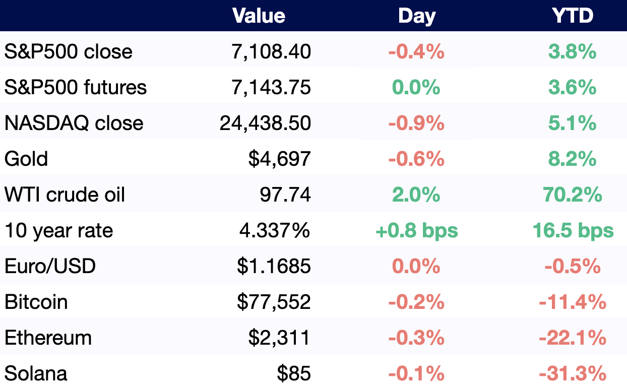 All values as of 6 AM ET / 3 AM PT, other than S&P500 and NASDAQ close (4 PM ET / 1 PM PT).
