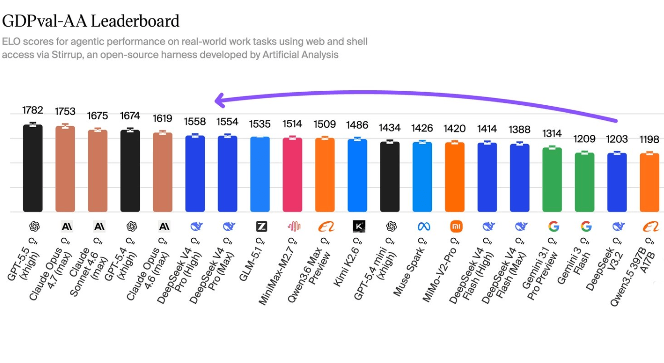 V4 Pro topped open-weight models on the GDPval-AA leaderboard: