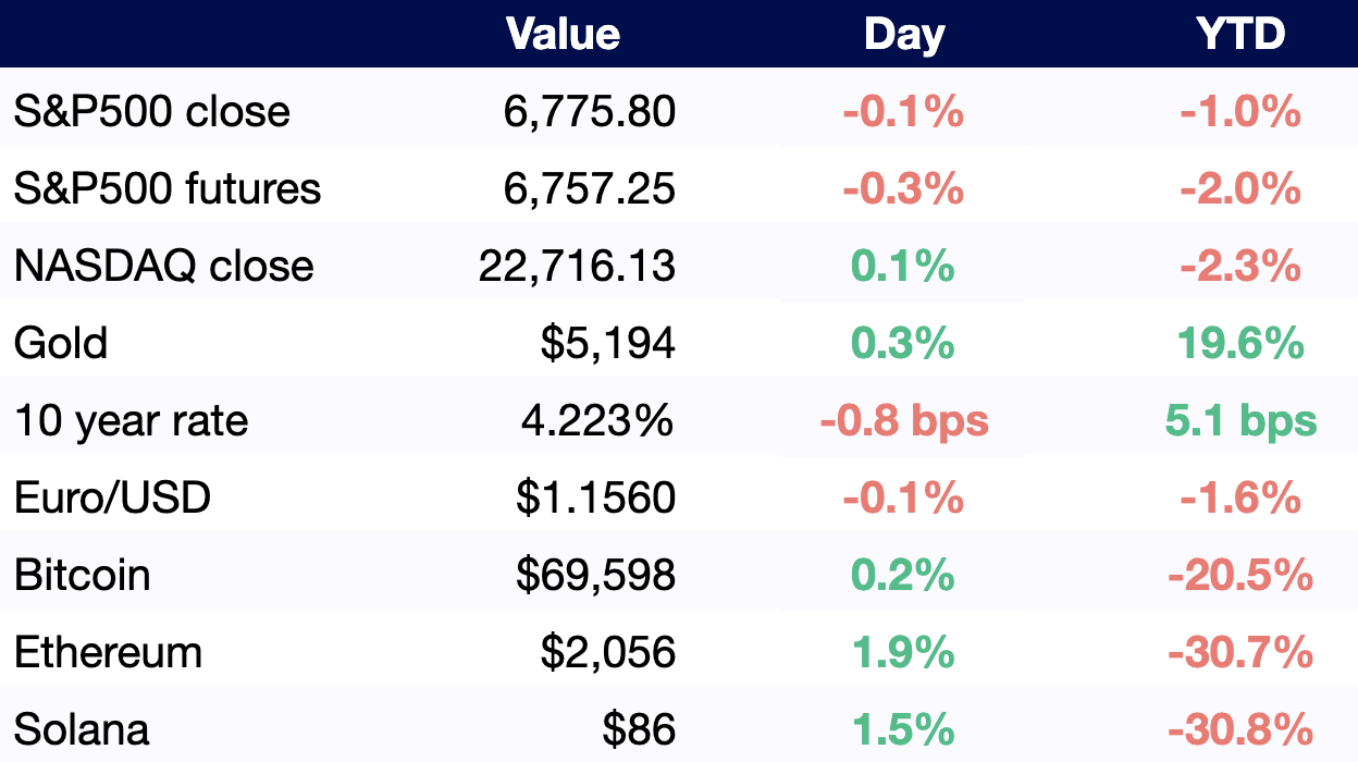 All values as of 6 AM ET / 3 AM PT, other than S&P500 and NASDAQ close (4 PM ET / 1 PM PT).