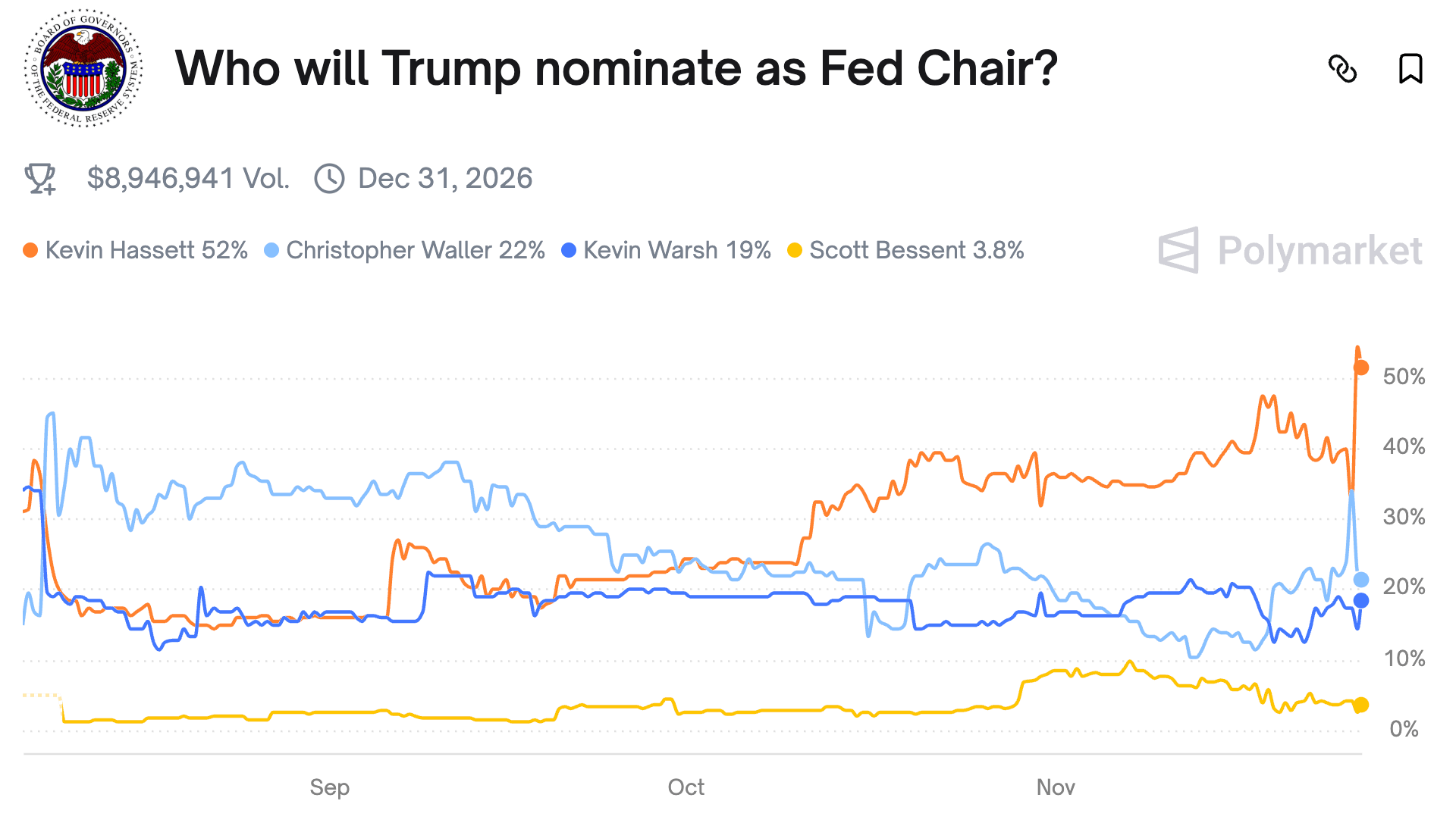 Polymarket has 52% odds on White House NEC Director Hassett becoming the next Fed chair: