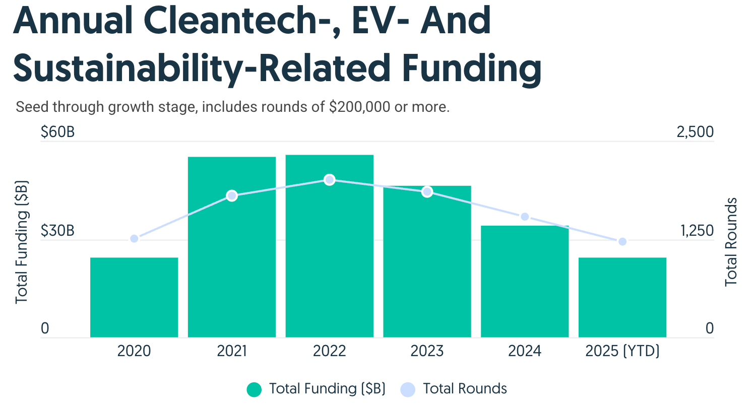 9. Global cleantech funding falls to $24B in 2025 YTD, lowest in 5 years