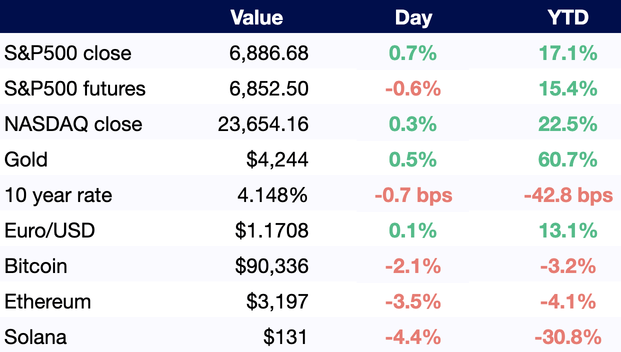 All values as of 6 AM ET / 3 AM PT, other than S&P500 and NASDAQ close (4 PM ET / 1 PM PT).