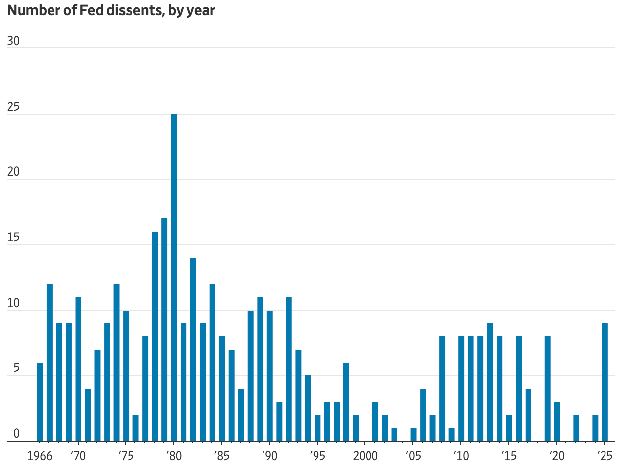 The FOMC voted 9-3 on Wed. to cut the federal funds rate by 25 bps to between 3.5%-3.75%: