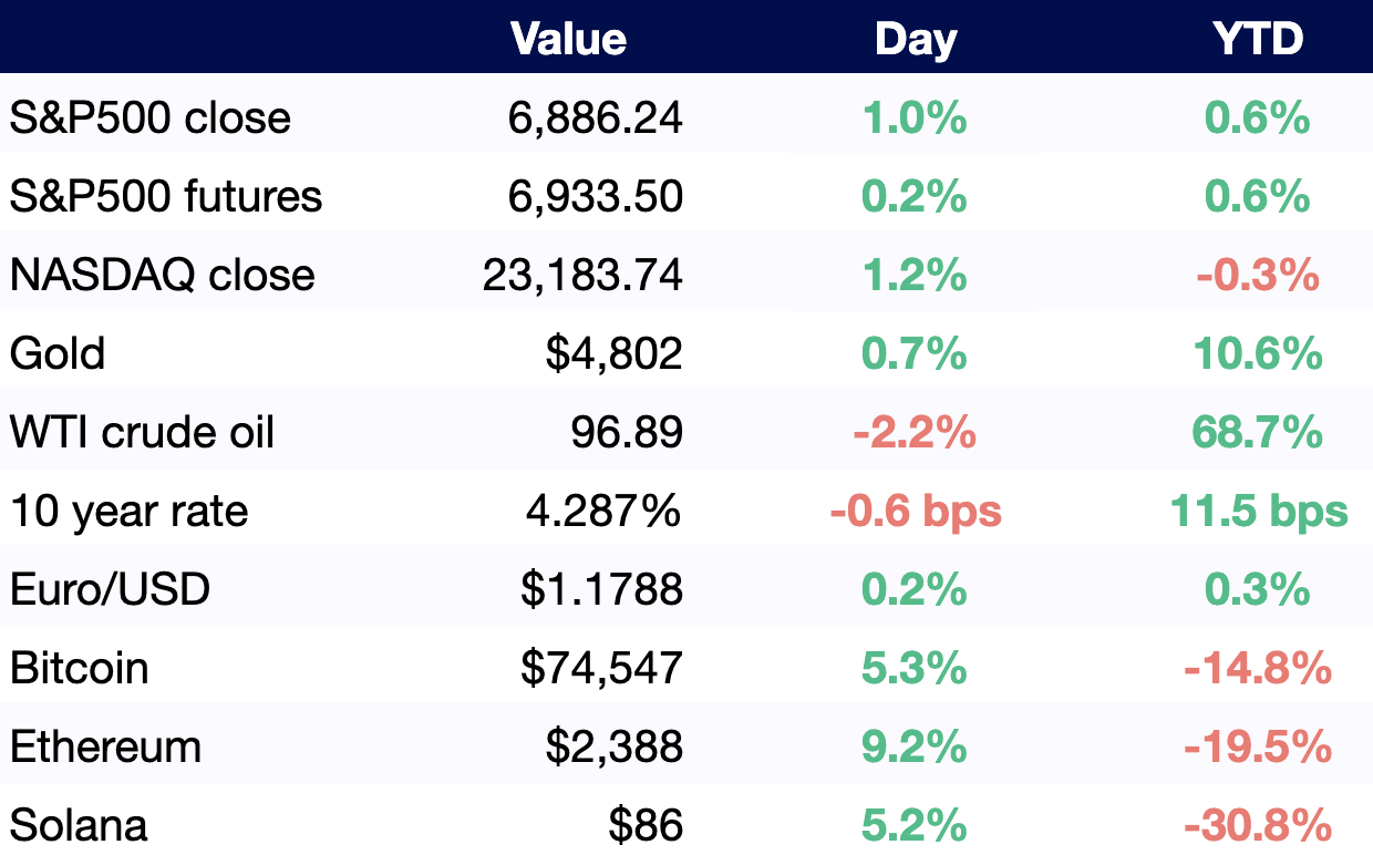 All values as of 6 AM ET / 3 AM PT, other than S&P500 and NASDAQ close (4 PM ET / 1 PM PT).