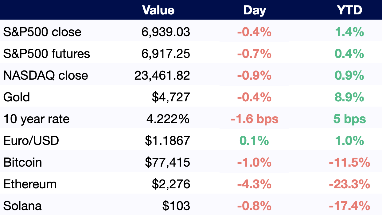 All values as of 6 AM ET / 3 AM PT, other than S&P500 and NASDAQ close (4 PM ET / 1 PM PT).