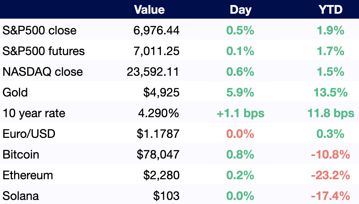All values as of 6 AM ET / 3 AM PT, other than S&P500 and NASDAQ close (4 PM ET / 1 PM PT).