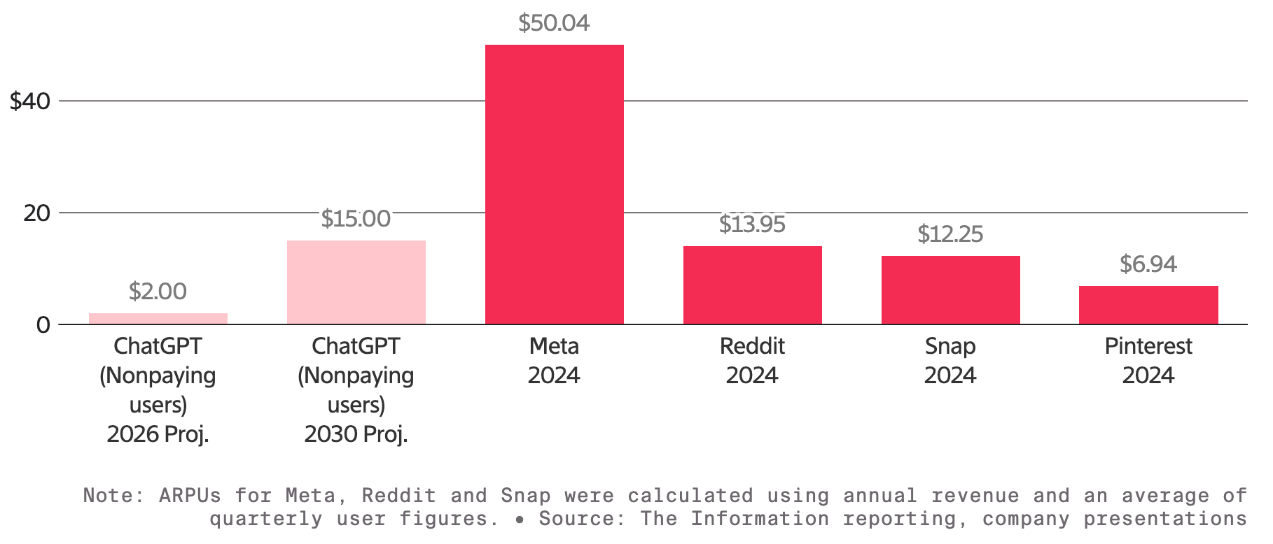 OpenAI has projected ChatGPTās nonpaying user ARPU will reach $15 by 2030, up from $2 in 2026: