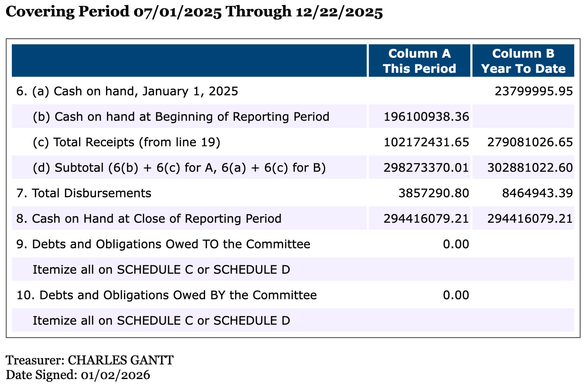 Trumpās super PAC raised $102M in H2 2025 and held $294M on hand as of Dec. 22, per an FEC filing: