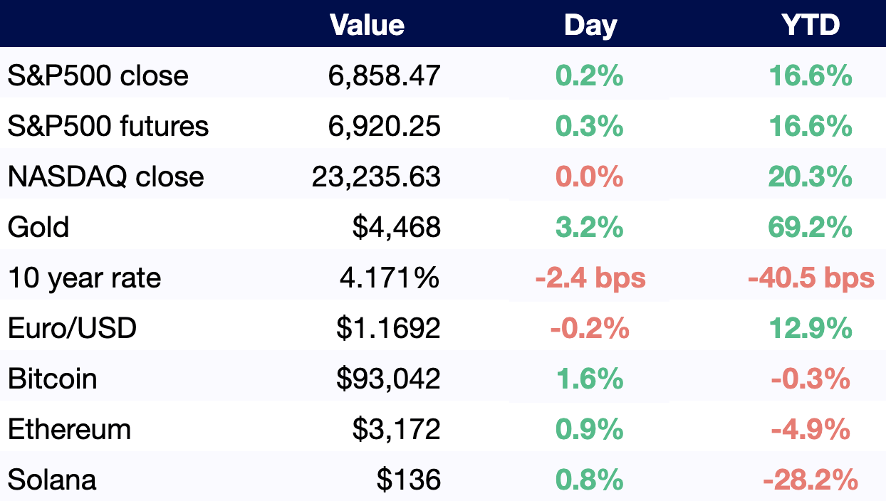 All values as of 6 AM ET / 3 AM PT, other than S&P500 and NASDAQ close (4 PM ET / 1 PM PT).