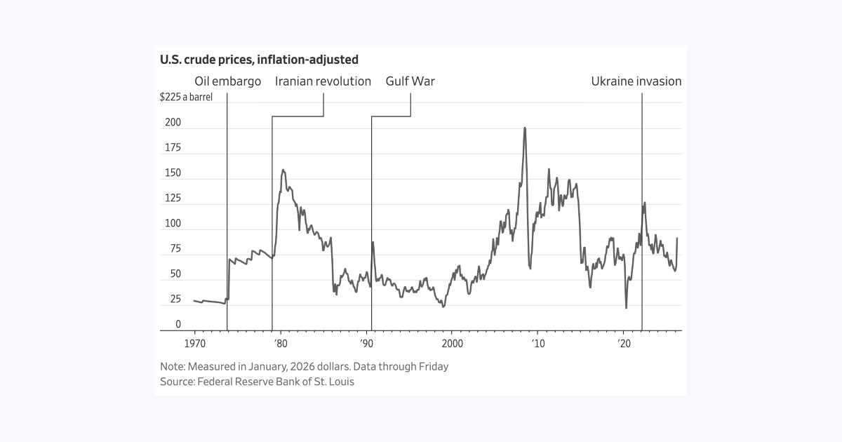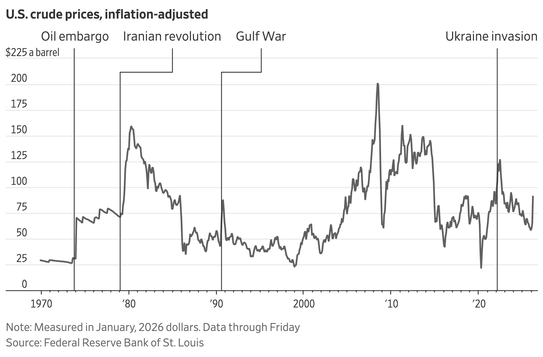 Oil prices surpassed $200 in inflation adjusted terms in 2008 during the Great Recession: