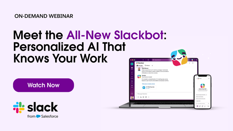Watch the on-demand webinar to see how Slackbot lives in the flow of work, already understanding your conversations, files, and people—delivering answers and actions that are relevant and personalized to you.