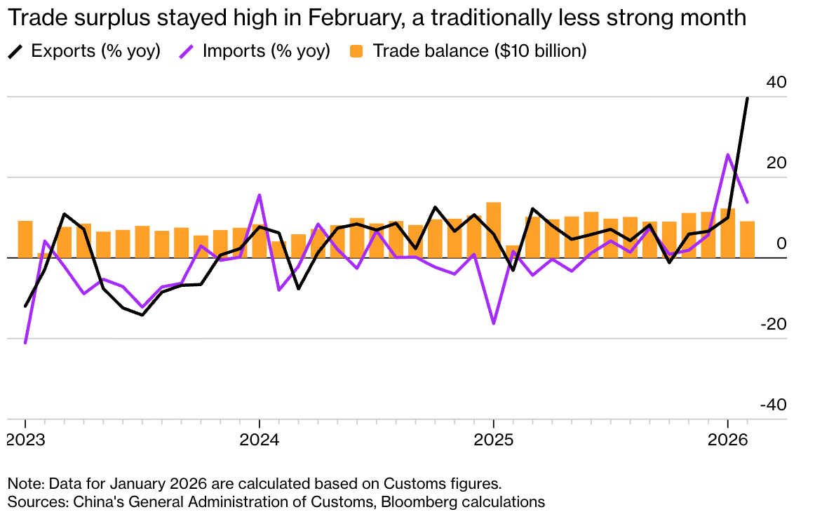 9. China exports +22% in early 2026, far above forecasts, imports +20%