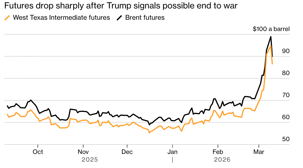 - WTI oil -9% to $87 as Trump says Iran war will end soon