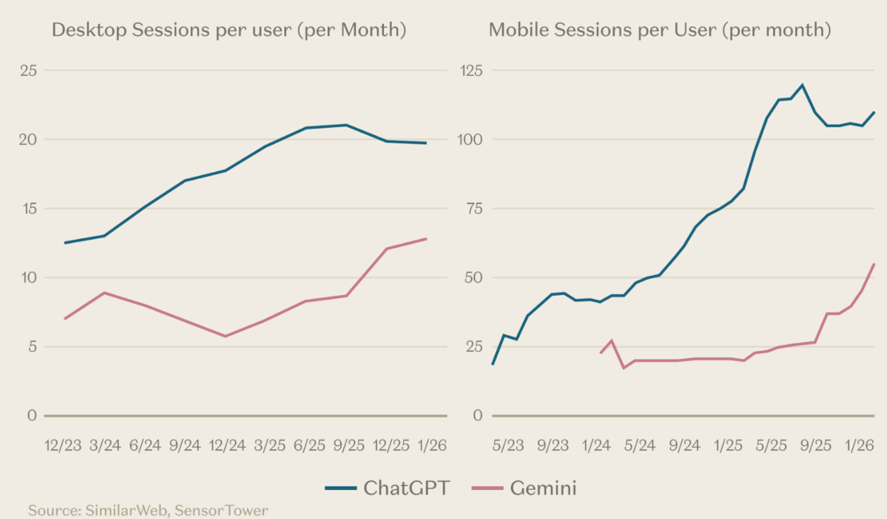 Gemini web usage is rising, but ChatGPT still leads with ~1.3× more sessions on web and ~2.2× more on mobile