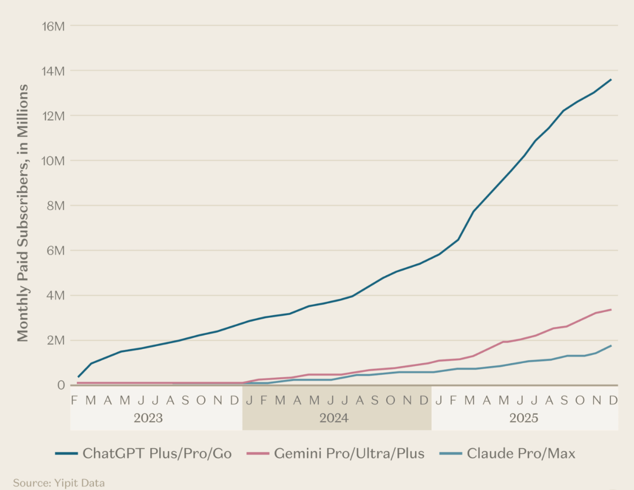 ChatGPT has remained ~8× larger than Claude and ~4× larger than Gemini in paid subscriptions